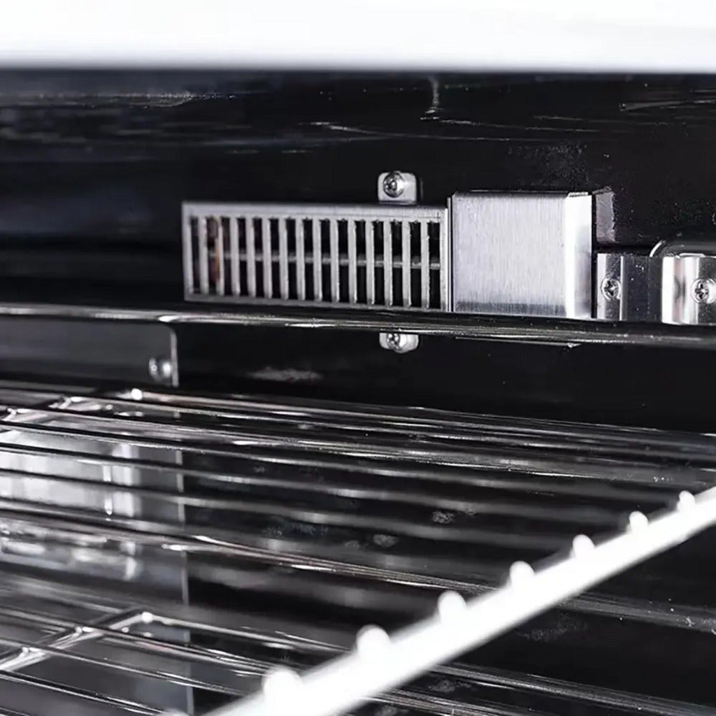 The Dukers DCCOG2 double convection oven offers precise temperature control from 175 to 500 degrees Fahrenheit via solid-state digital controls. Its two-speed fan, featuring an adjustable cool-down mode, ensures even heat distribution for consistent cooking results. Each oven deck includes an electronic spark ignition system and an automatic pilot with a safety shutoff, enhancing operator safety during use.